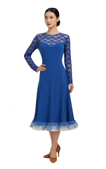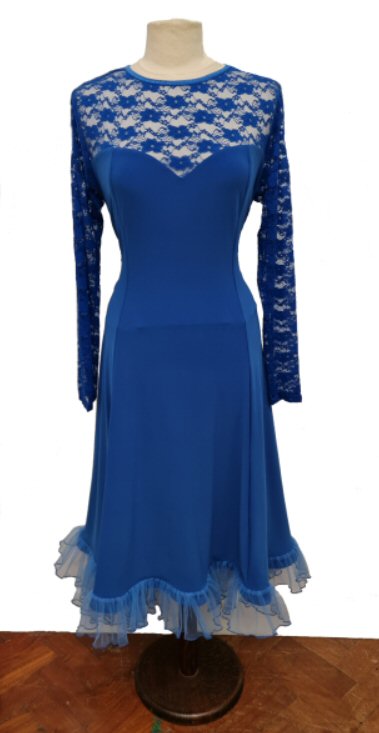 This superb Ballroom dress is made of stretch jersey which is soft in touch and flows beautifully. Lace sleeves and back. The dress comes with separate bra cups, which you can insert in way convenient to you.Model height is 5ft 8in (172cm) and the dress on photo is 52" (132cm) Length from top of shoulder to hem . Other lengths also available.