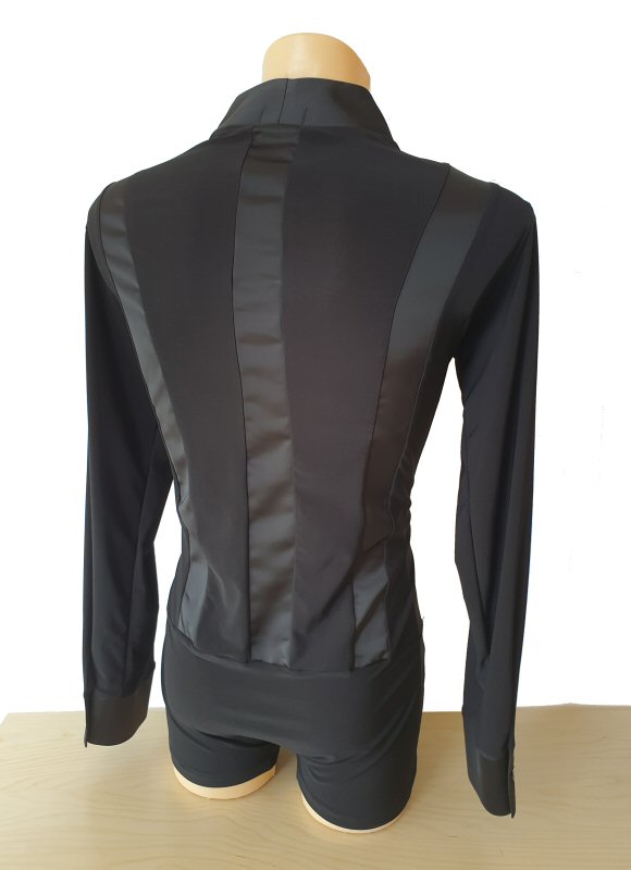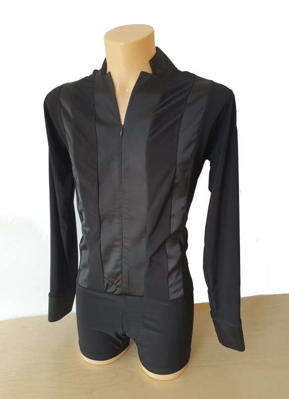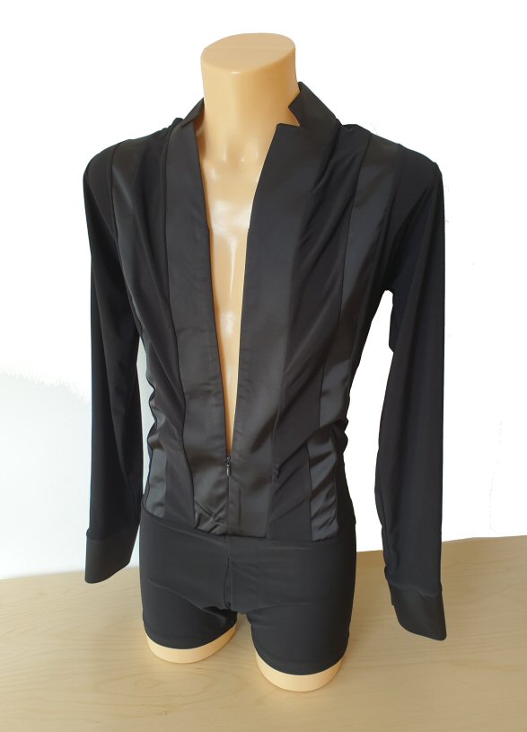 Macho stripe Latin body shirt is made of two fabrics: Stretch jersey and stretch satin. Masculine style collar. Zip at front allows you to have a V-neck as large as you like.