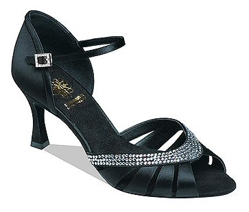 Style 1543 Black satin Price £125.00 excl.VAT With Genuine Swarovski Crystals. Square Diamond Hook Buckle. 2" flare heel. |