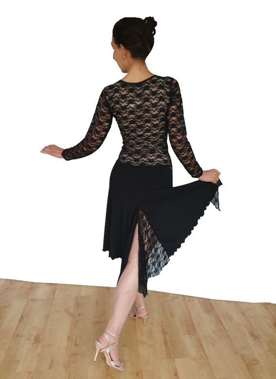 This is a nice 2-piece set great for Tango or Latin, but you can purchase the top or the skirt separately. Made in soft in touch, stretch jersey and lace.