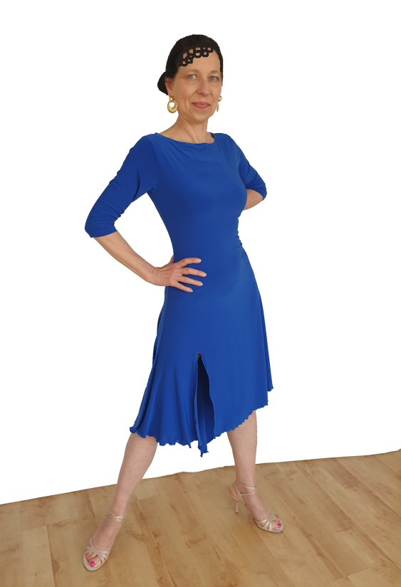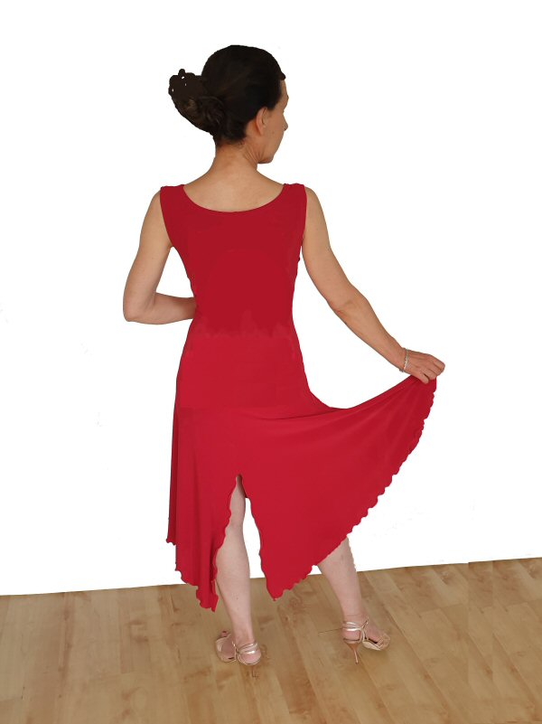 Classic, Tango lines with a split on the right thigh and longer section at the back. The dress is stretchy and will adapt to your shape easily. Easy care: Machine washable, will dry quickly and does not require ironing. 5 different lengths are available.