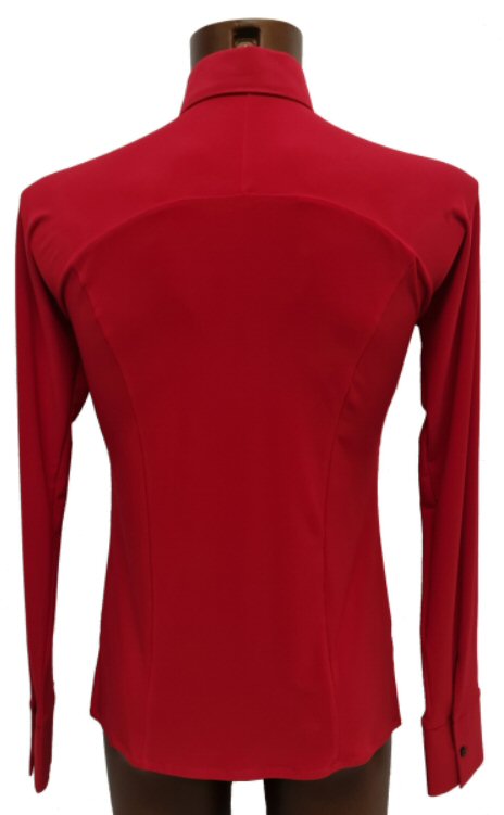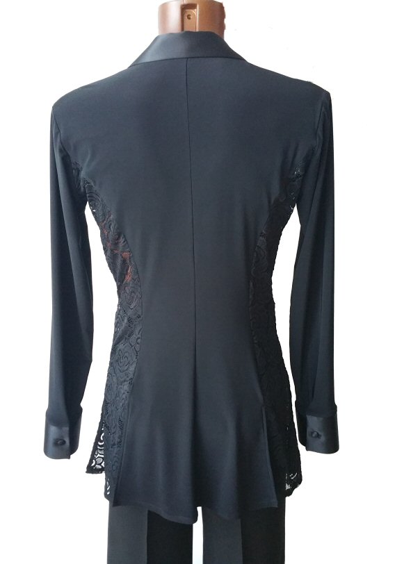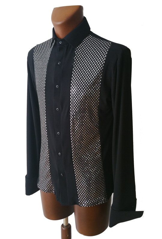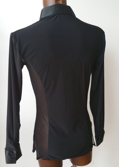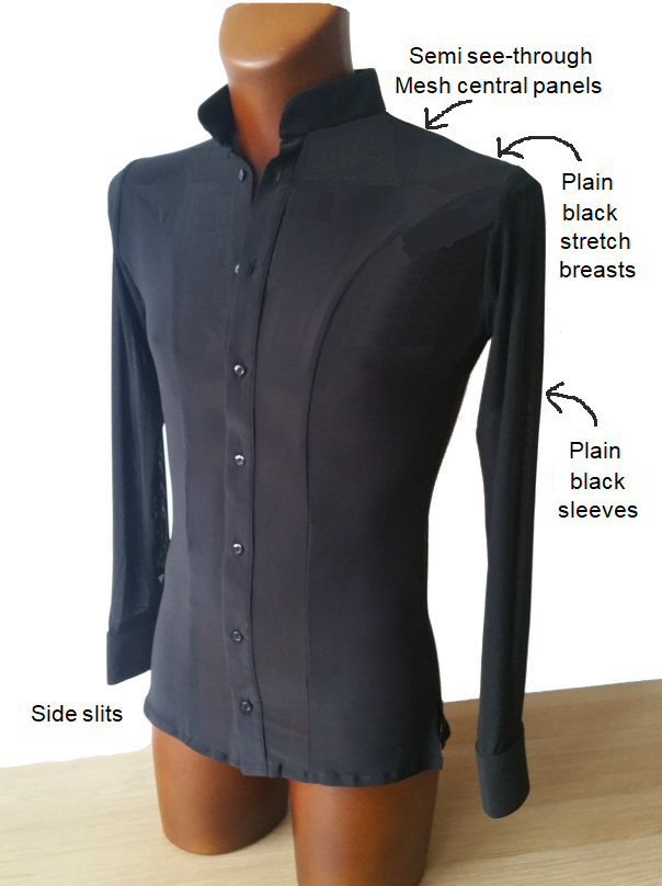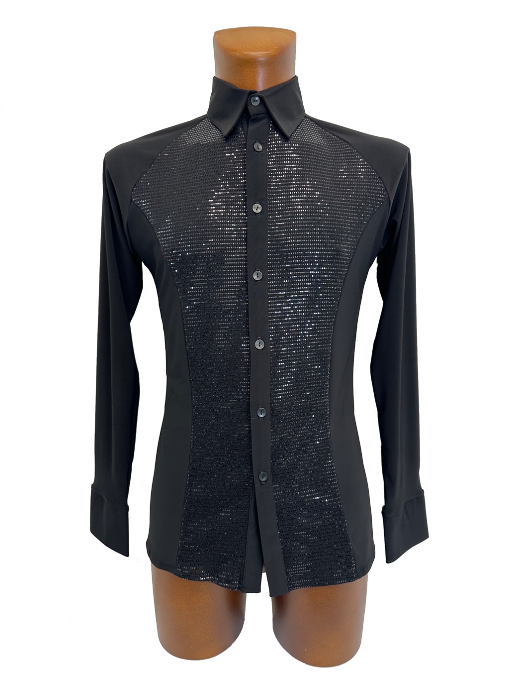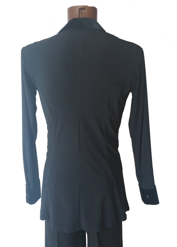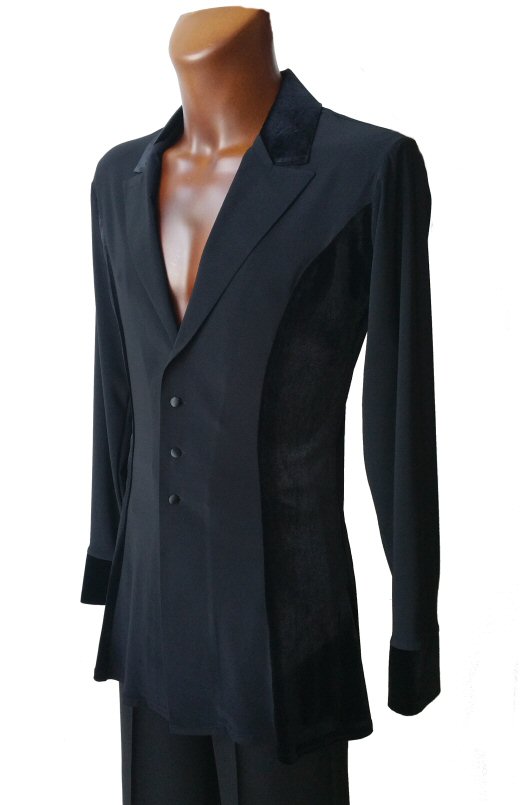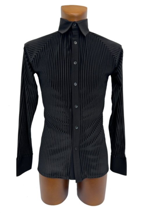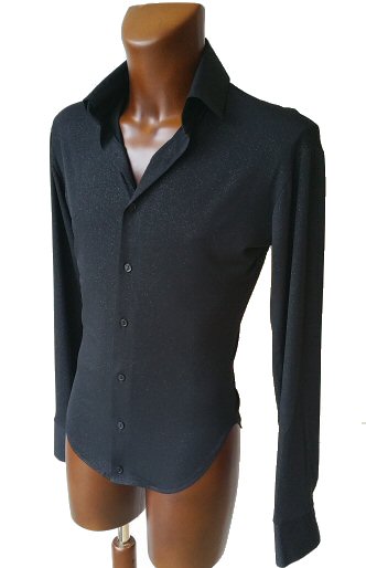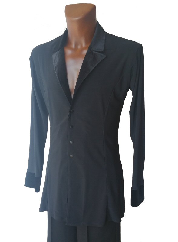 Raglan cut latin shirt made of stretchy velvet stripe fabric. Single cuff with button. Black. |