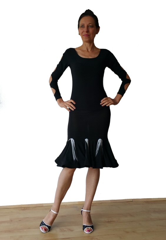 Knee length skirt with crinoline hem will be great for Salsa, Latin and other styles. The skirt is made in very stretchy, soft black crepe and comes with shaded Black/White fringe scattered in 8 places around on semi-circle godets. Elasticated waist.