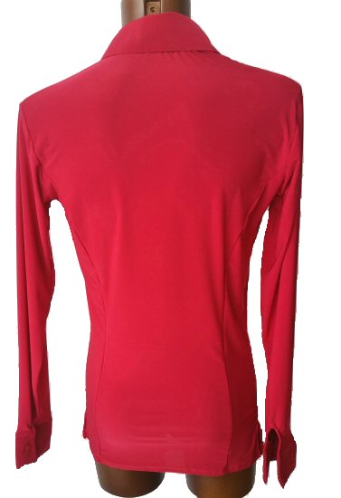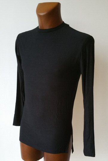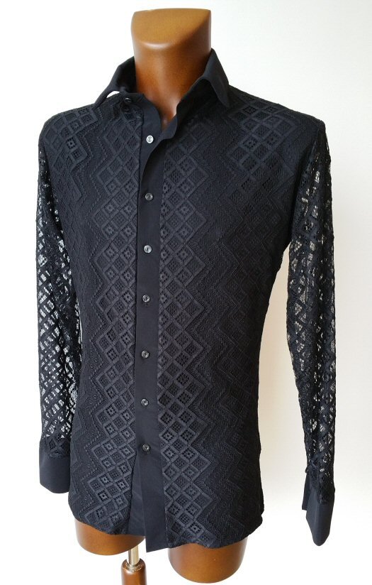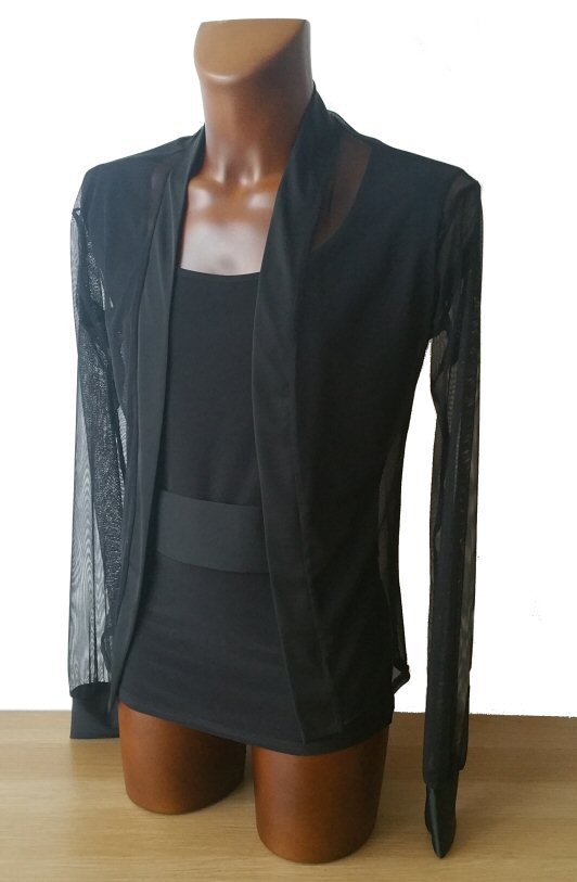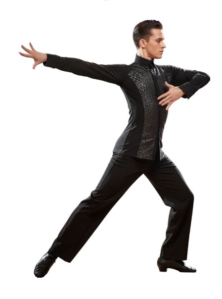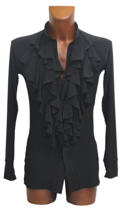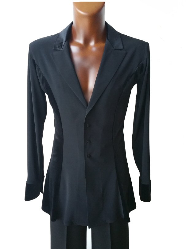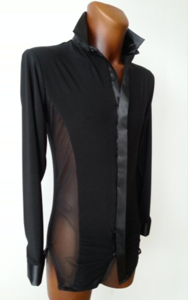 Raglan cut latin shirt made of stretchy velvet stripe fabric. Single cuff with button. Black. |