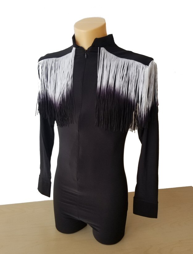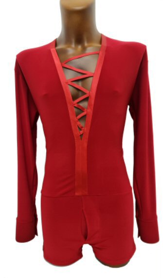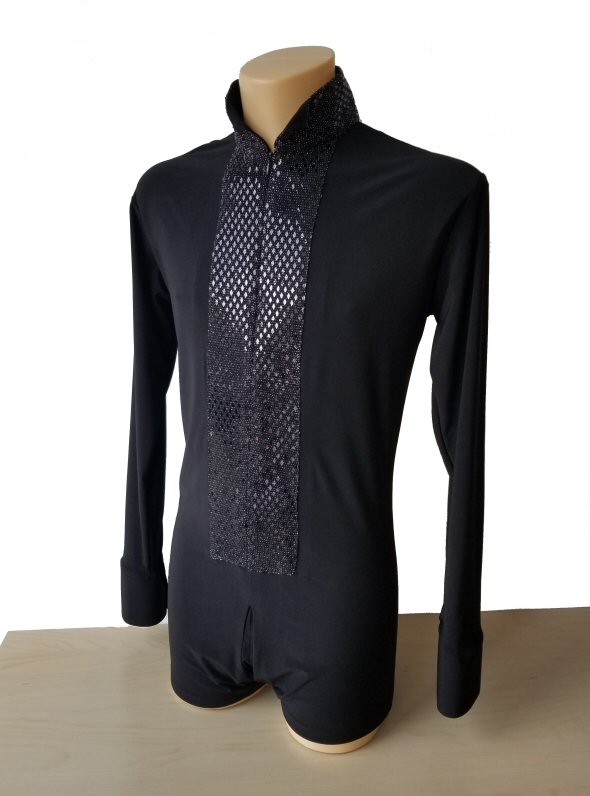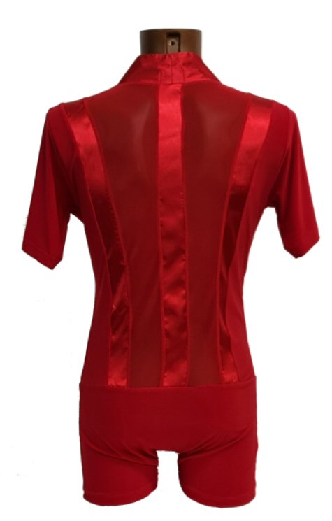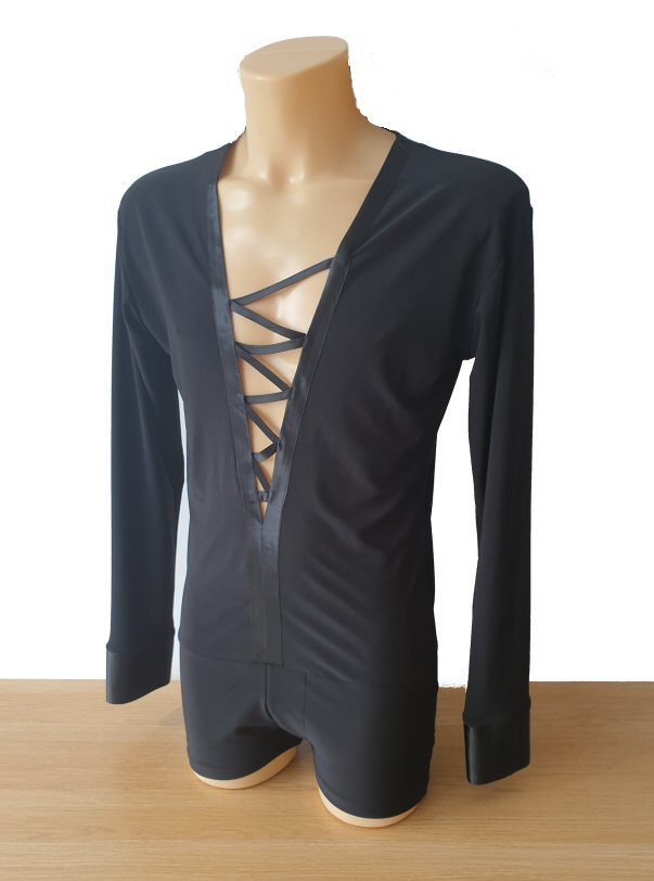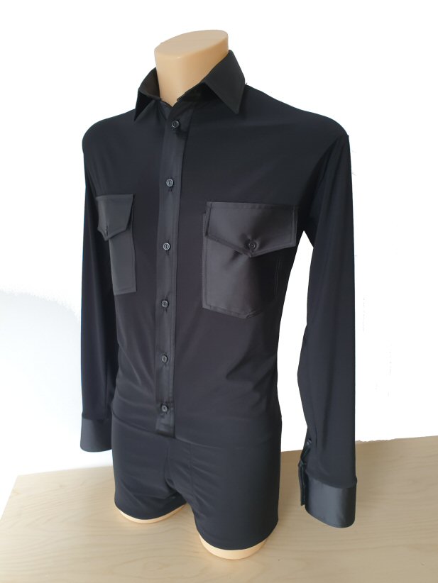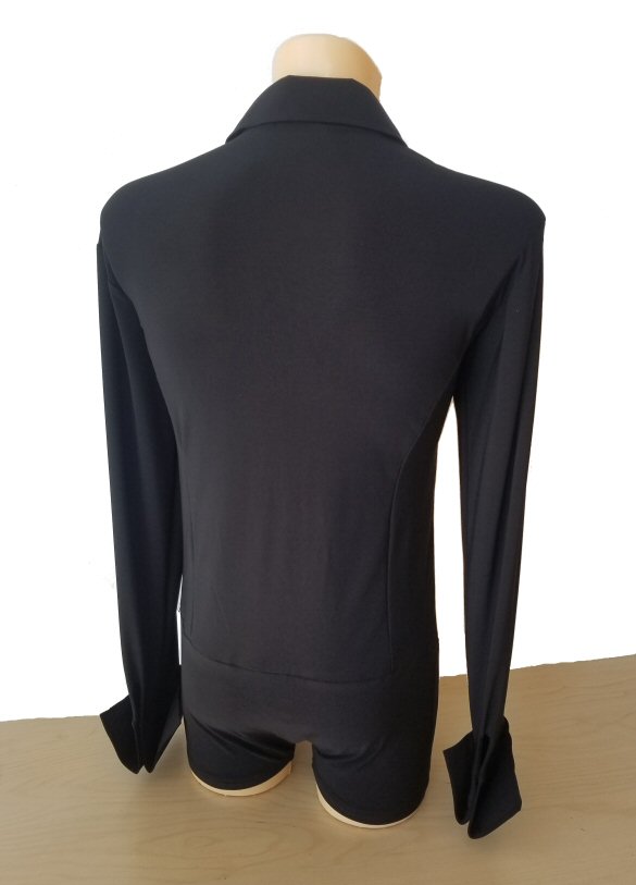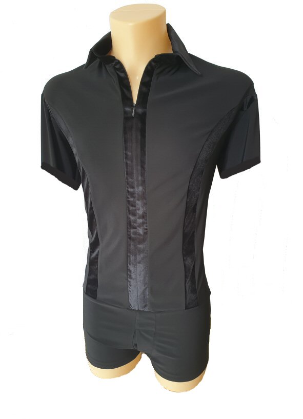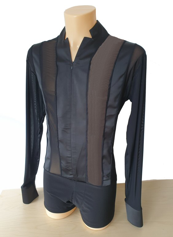 This latin body shirt is made of two fabrics: Stretch jersey and stretch satin. Masculine style collar. Zip at front allows you to have a V-neck as large as you like.