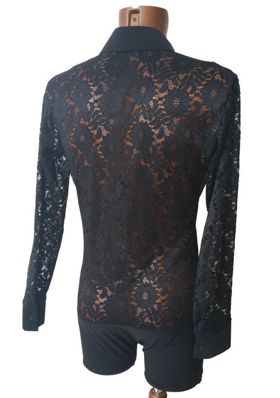 Semi-see through lace fabric on the sleeves, the back and body sides. Solid black stretch crepe on the front. Traditional collar, buttons and button cuffs. The collar size goes in proportion with the body size and it is slightly larger, but this type of shirt is best worn with top button open, so you do not need an exact collar size. This shirt is built on boxer shorts, so it will never pull out of your trousers.