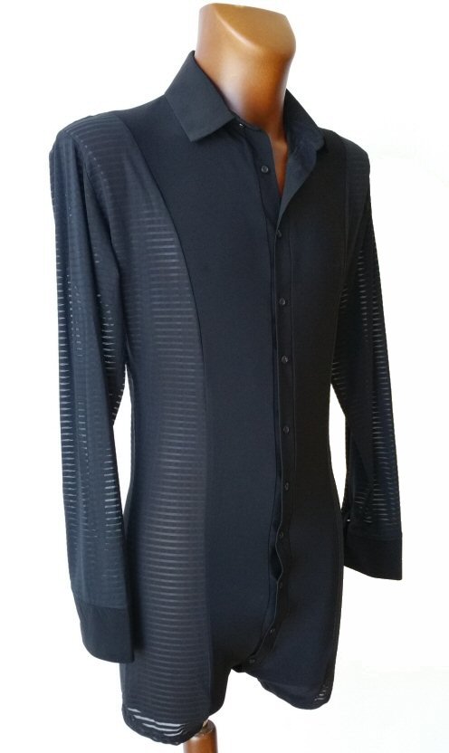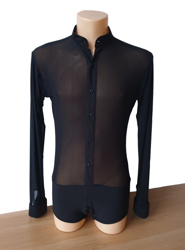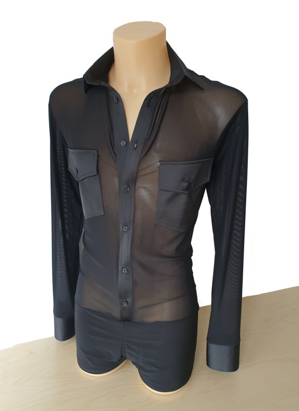 Stretch mens style latin body shirt, which will also work well for a female dancer dancing a mens role. A layer of flock net is on flesh mesh lining, so the shirt is not see-through, althought it gives an illusion of being see-through. Single cuff with button.