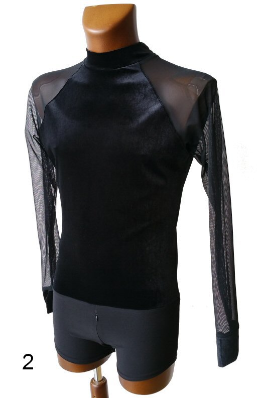 Latin body shirt made in strethy flocked net, A layer of flock net is on flesh mesh lining, so the shirt is not see-through, althought it gives an illusion of being see-through. Single cuff with button.