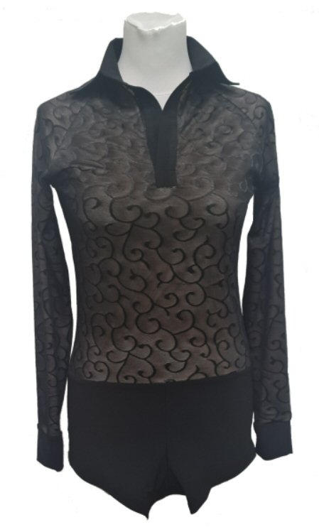 Asymmetrical design stretchy latin shirt with one half being plain black and one side with subtle pattern. The flock net is fitted over a skin colour lining, so the shirt is not see through.