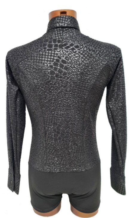 Black Snake effect Raglan cut, stretchy Latin shirt on shorts. Single cuff with button. Black.