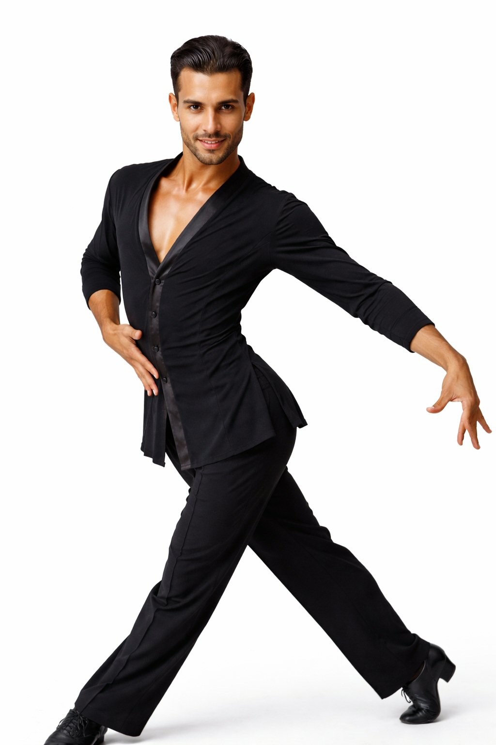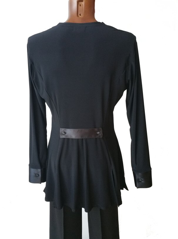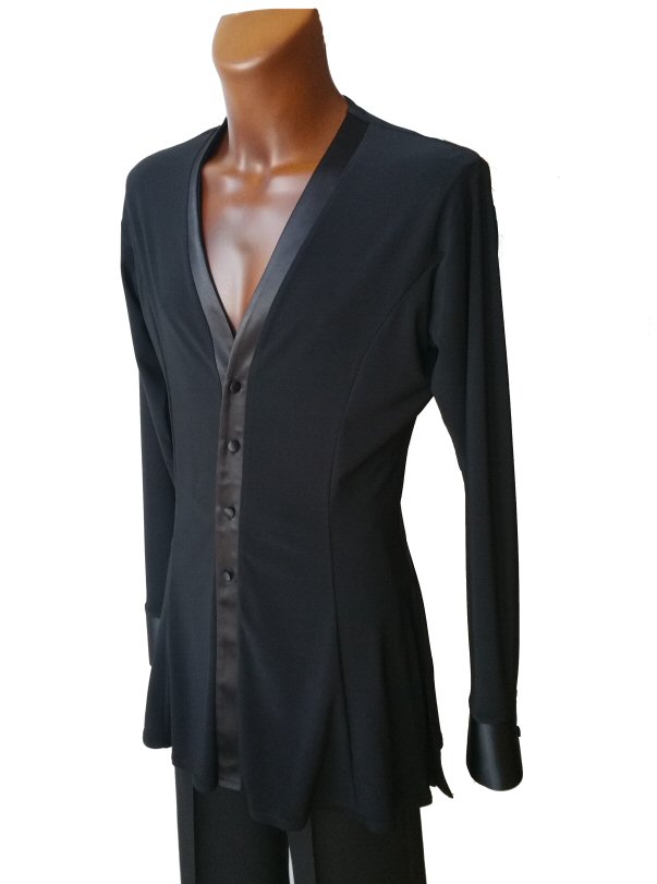 This Jacket style Shirt is a more contemporary design, but it also gives you a very smart look and is light to wear like a shirt. Made in stretch crepe with high quality satin edging it easily adjusts to your body moves. Flared hem line with slits allows the hem to move freely as you spin adding impact to your moves. The collar and cuffs are finished with high quality satin. Satin covered buttons and detachable satin back detail complete the perfect look.This shirt is designed to be worn outside your trousers. Machine washable. The plain stretch crepe can be for stoned for your performance.