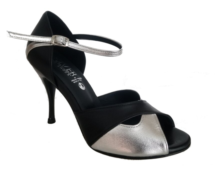 Volver 032 Reyna (for Argentine Tango) Black leather/Silver leather, Heel 90S 90mm (3.5") (Volver heels explained) Tango Leather soles, size 7 (Volver size 39 European 40) - Now only £69.00 excl.VAT |