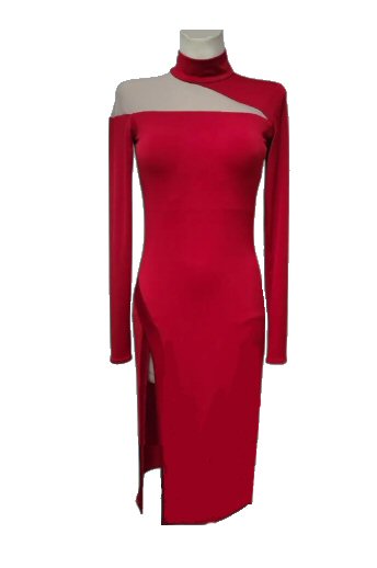 Cool Argentine Tango dress with slit on the right leg and "open" shoulder. The shoulder area is in fact covered with dark flesh mesh, which creates an illusion of it being open. The fabric is very stretchy like lycra, but softer in touch and easy care: machine washable, dries quickly and does not require ironing.