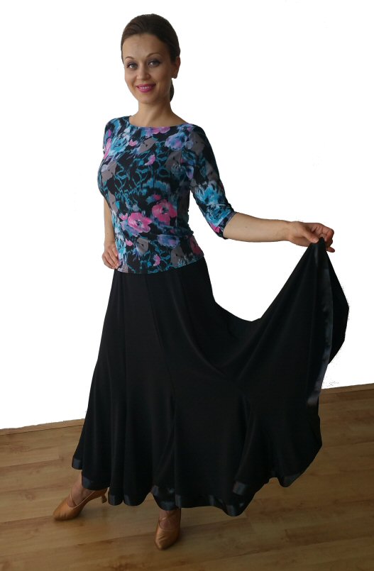 Magnificent flow ballroom skirt made of four panels and finished with mesh. Body friendly stretch crepe. Very easy care: Machine washable, dries quickly and does not require iroining. Does not crease.