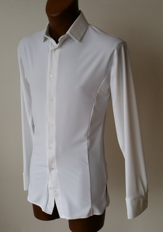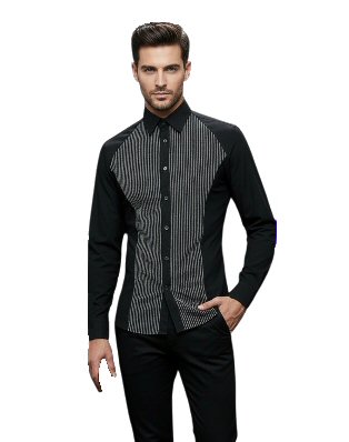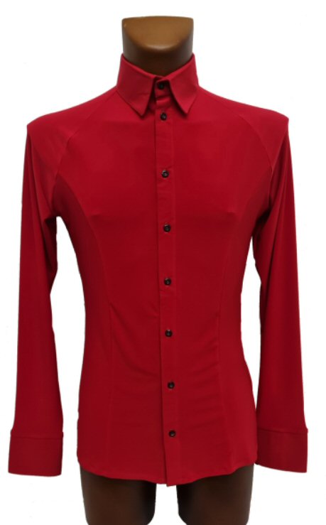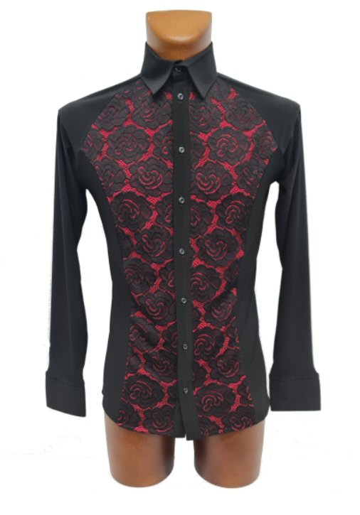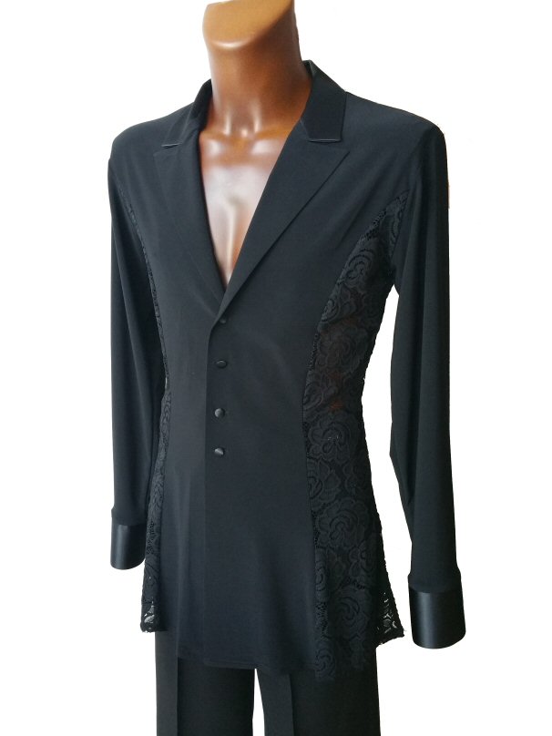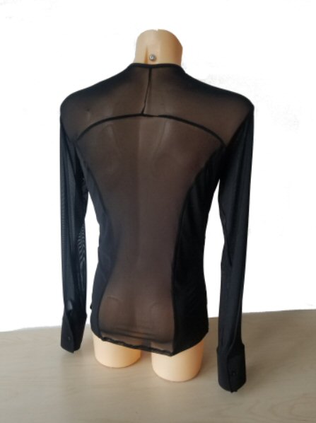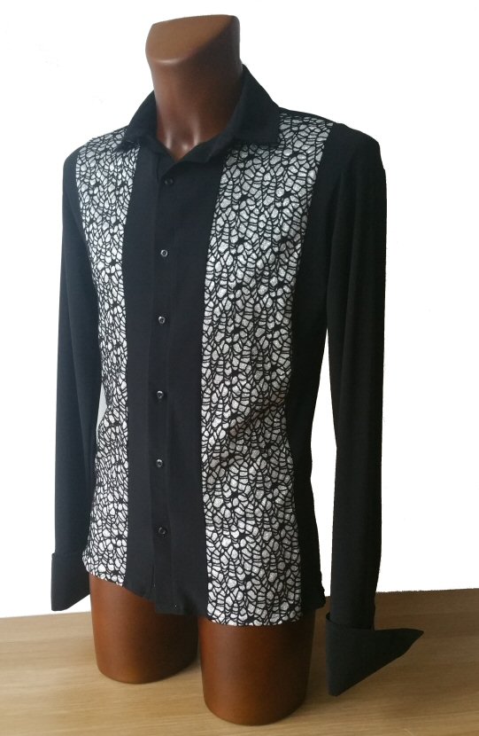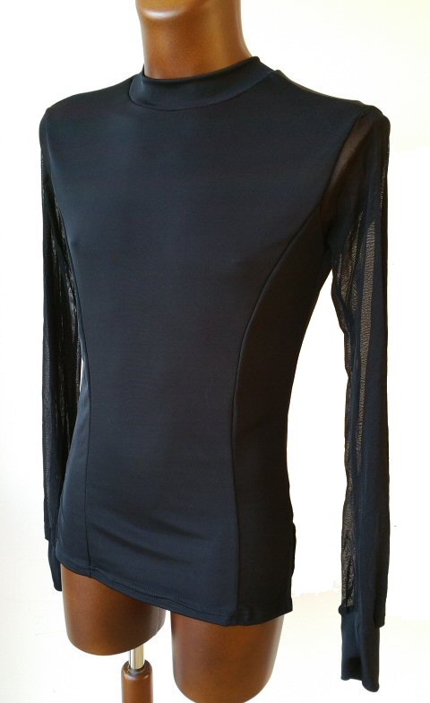 Raglan cut latin shirt made of stretchy velvet stripe fabric. Single cuff with button. Black. |