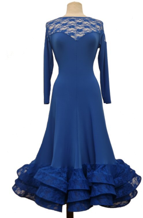 This superb Ballroom dress is made of stretch jersey which is soft in touch and flows beautifully. Lace sleeves and back. The dress comes with separate bra cups, which you can insert in way convenient to you.