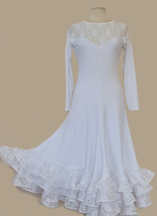 This soft and body friendly dress makes beautiful pictures on all ladies young and old, small and large. It is made of four panels and has a triple hem made with lace and crinoline tape for enhanced ballroom feel. Your back is beautifully presented behind a single layer of lace. Various colours possible.
