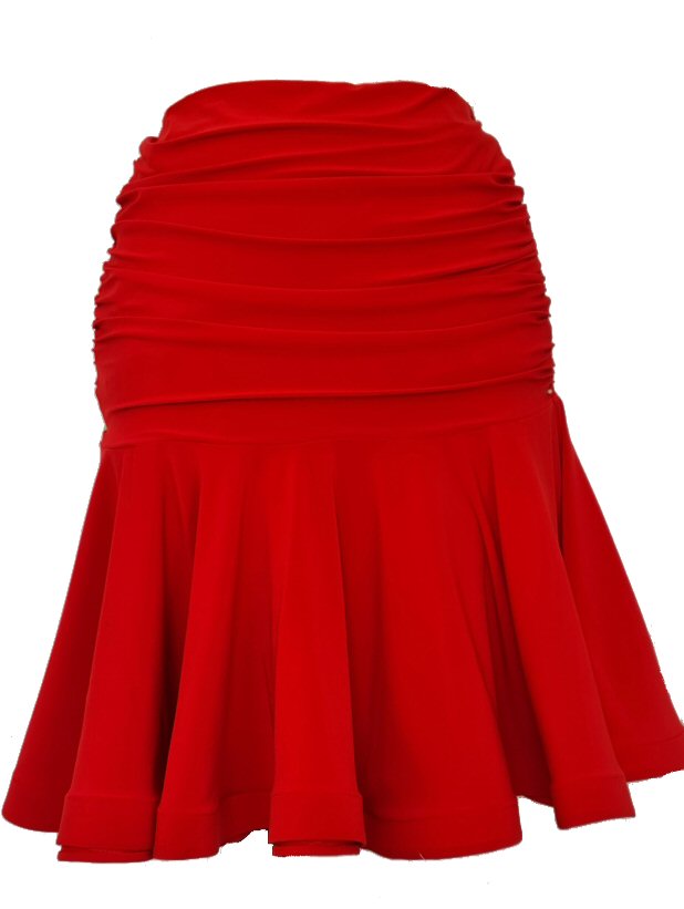 Short latin skirt with rouching in the upper part and freely flowing, full circle lower part. Crinoline hem optional. Optionally panties can be built in.