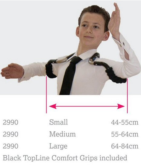 The Topline dance frame has been around for a couple of years. We have been a little sceptical at first, but we have recently seen an impressive progress a group of young dancers made to their ballroom top lines using this frame and the conclusion is simply overwhelming: It really works! The Topline dance frame is a revolutionary training aid. It develops muscle memory, promotes full body rotation and enhances your body shape. Use it regulary at your practice by simply dancing in it. The frame will keep your top line immaculate. Your muscles will memorise the position. Towards the end of your practice remove the frame and dance the same routines without it. Do it regulary and your top line will be transformed from average to immaculate within a couple of months. The topline frame is light and easy to carry. It has a modular construction and disassembles quickly and easily into parts which you can fit into a small box. Suitable for both male and female dancers, although it is more beneficial when used by the male (the leader). Designed and made in Britain. Available in 3 sizes for children and adults.