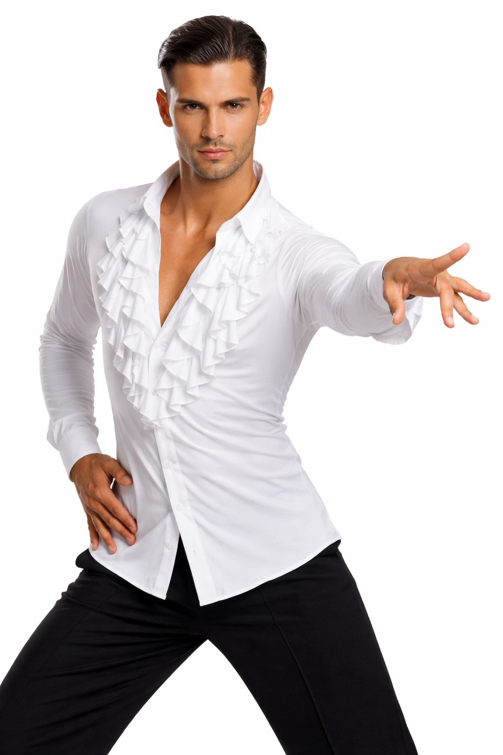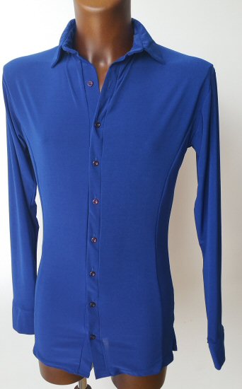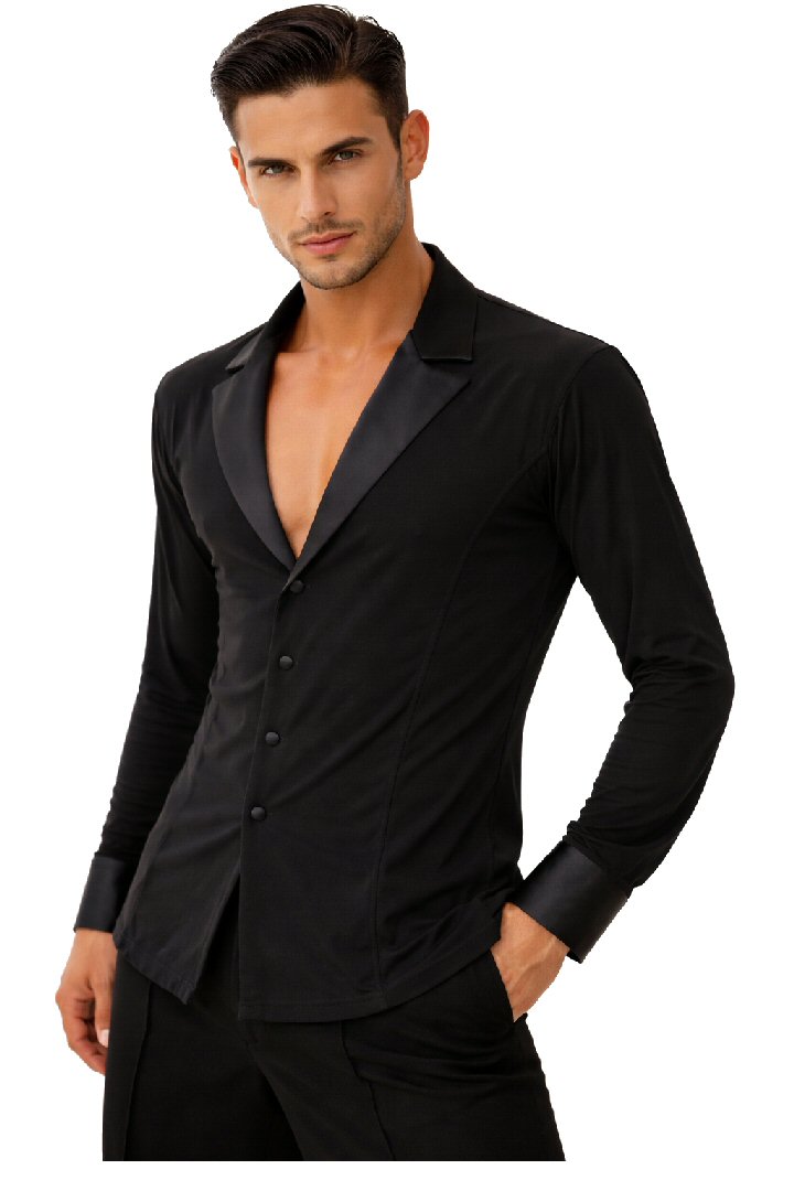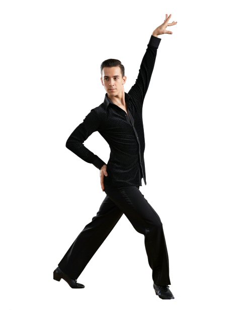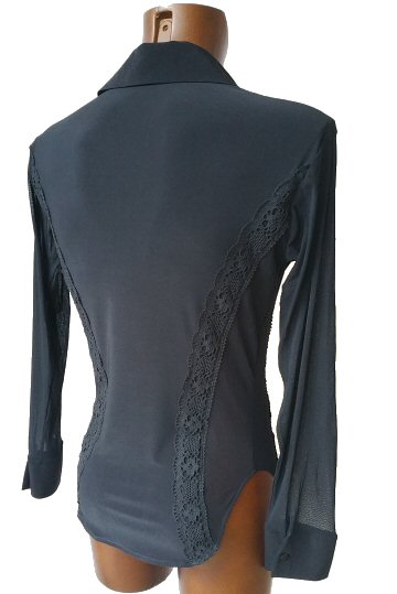 Raglan cut latin shirt made of stretchy velvet stripe fabric. Single cuff with button. Black. |