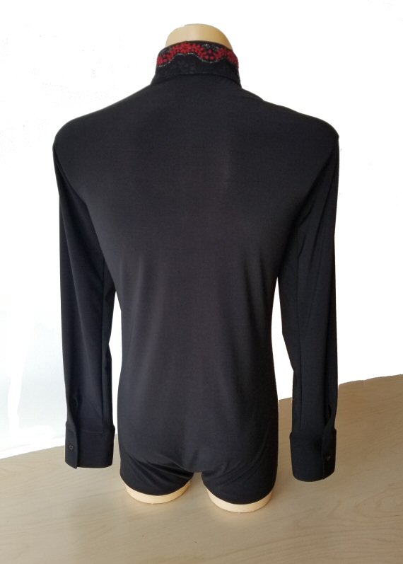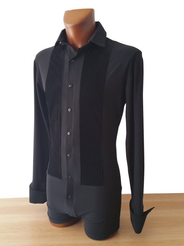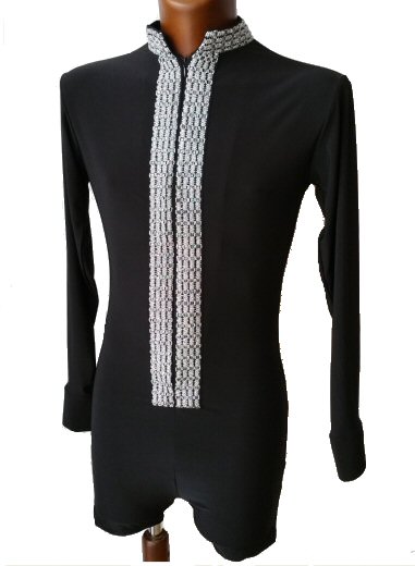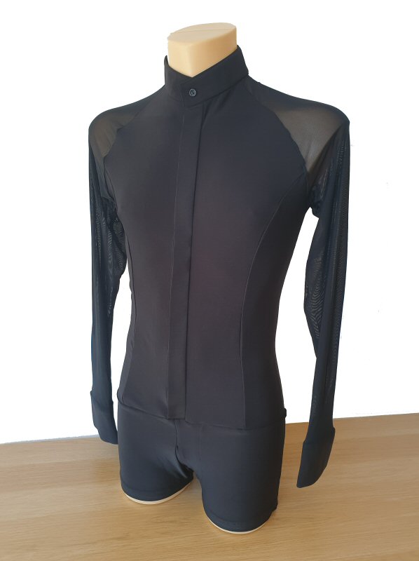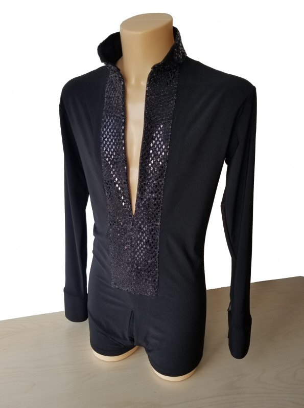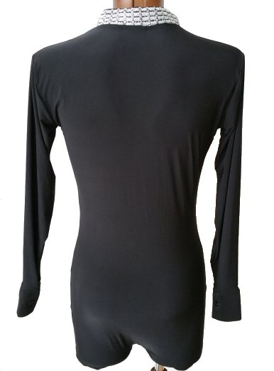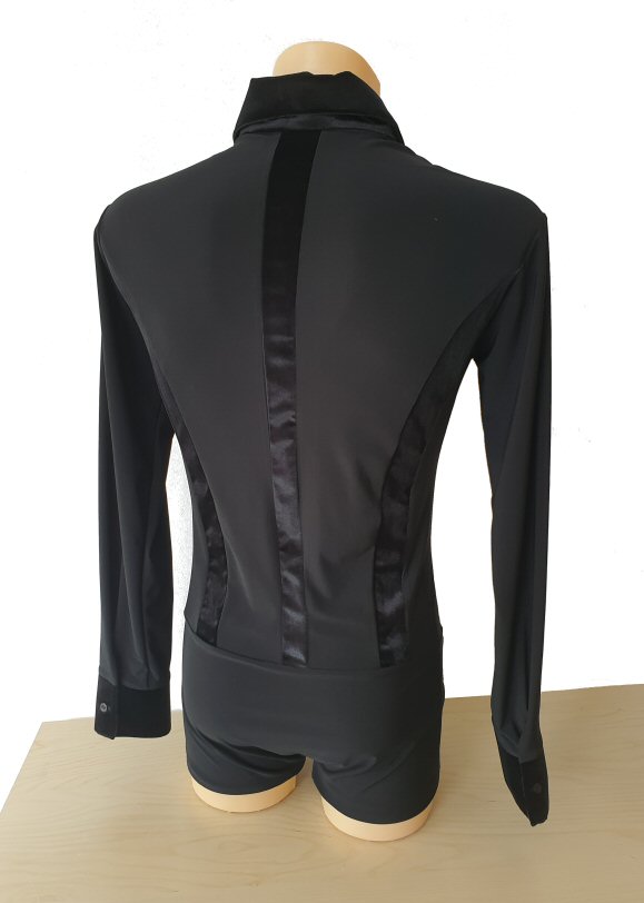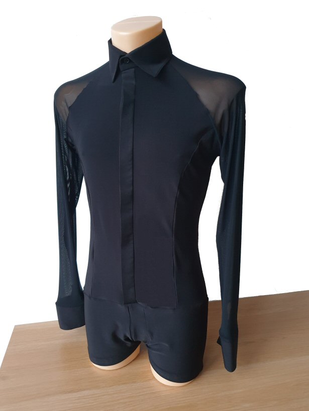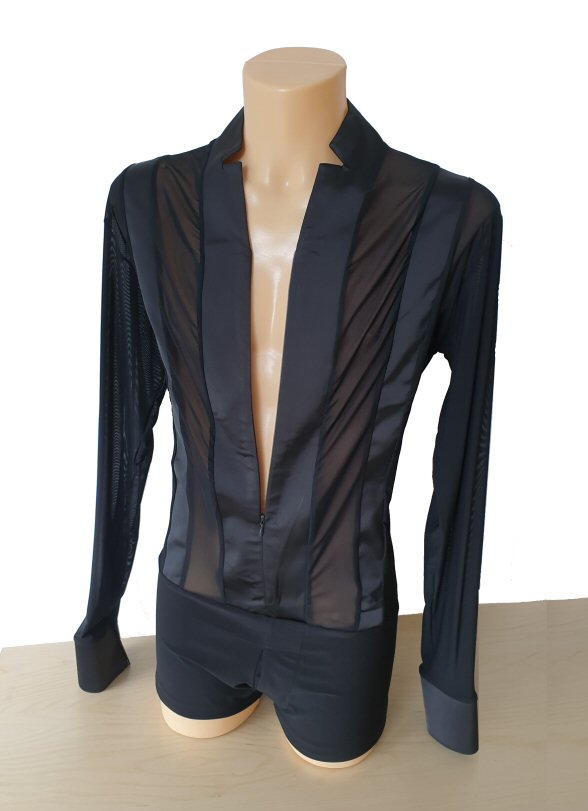 This latin body shirt is made of two fabrics: Stretch jersey and stretch satin. Masculine style collar. Zip at front allows you to have a V-neck as large as you like.