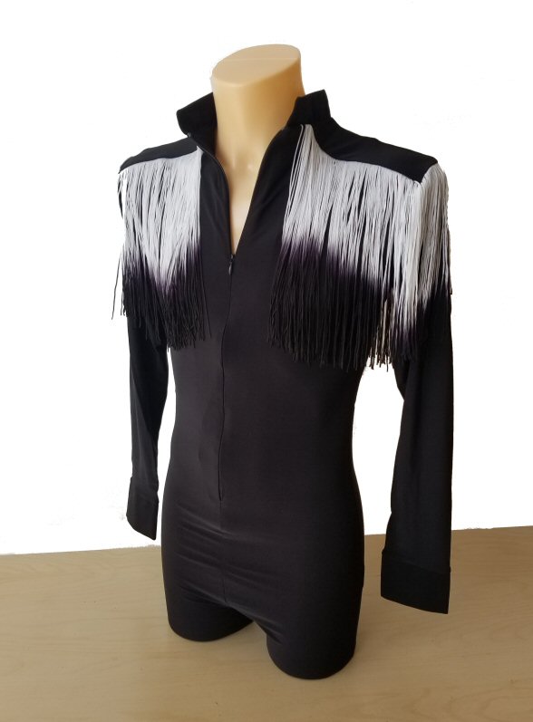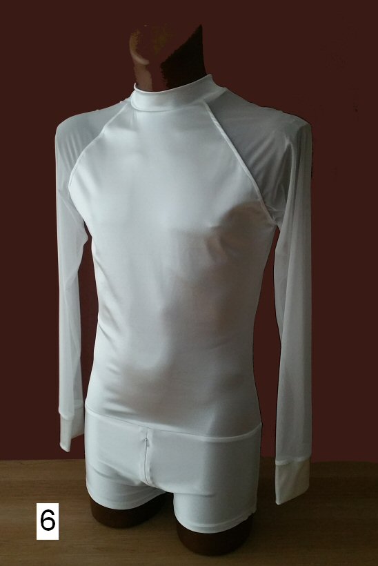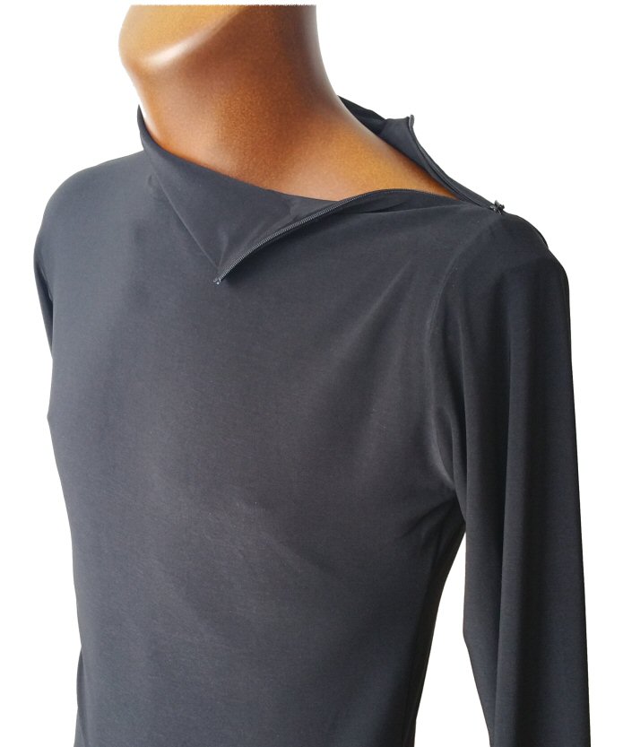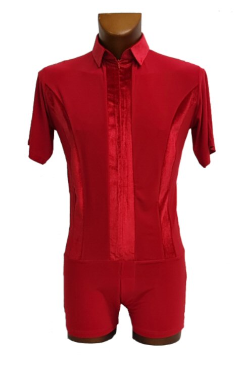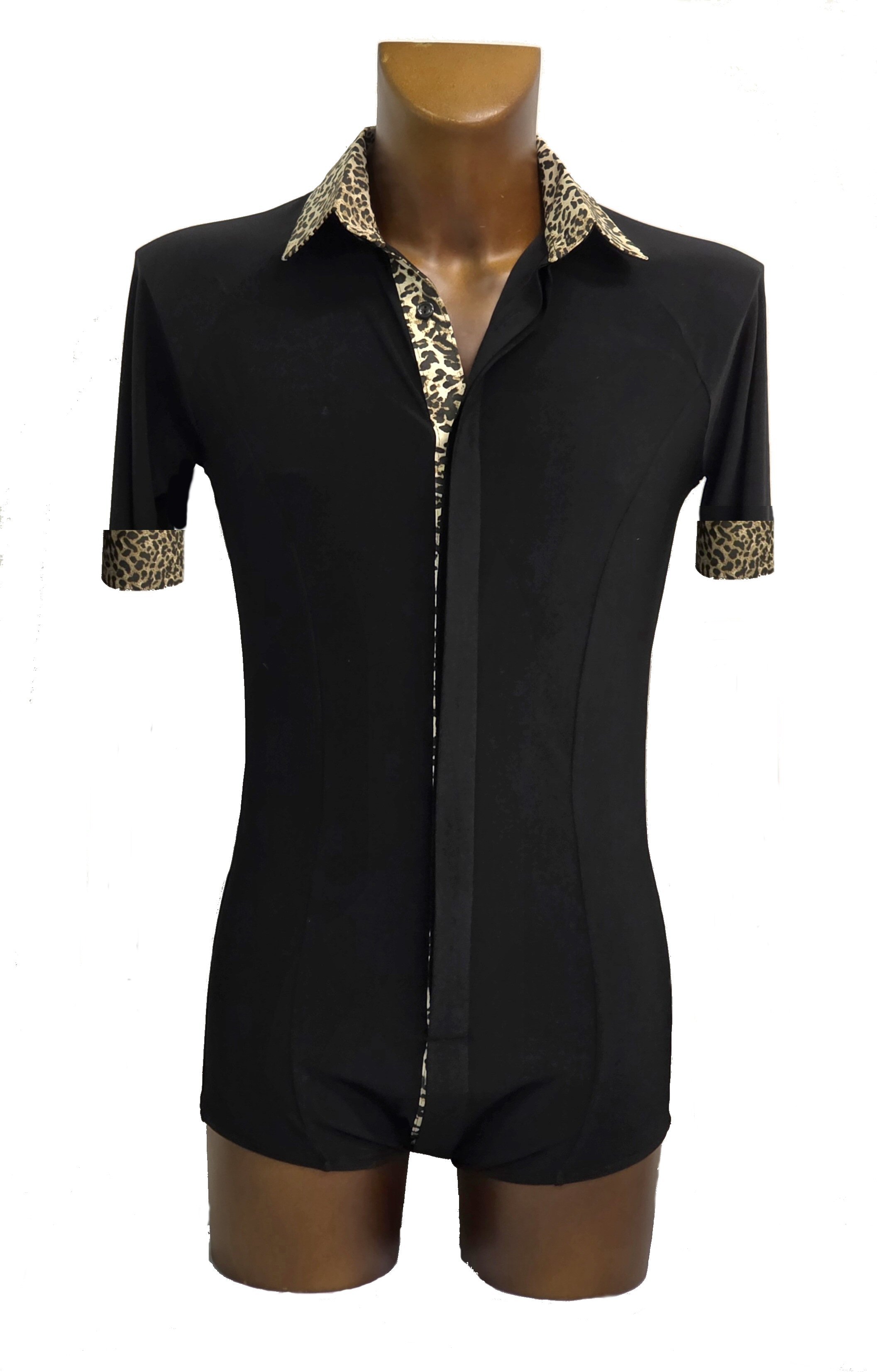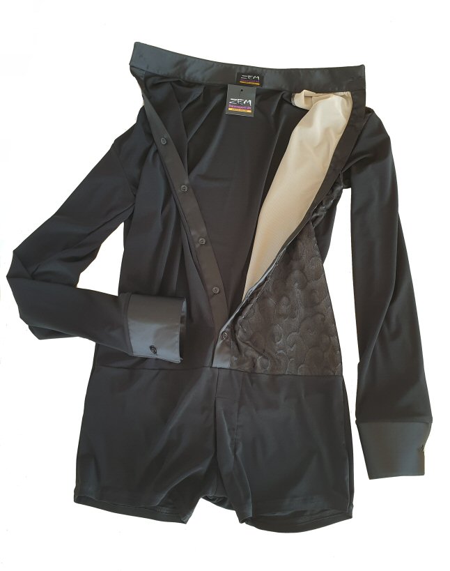 This latin body shirt is made of two fabrics: Stretch jersey and stretch satin. Masculine style collar. Zip at front allows you to have a V-neck as large as you like.