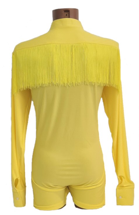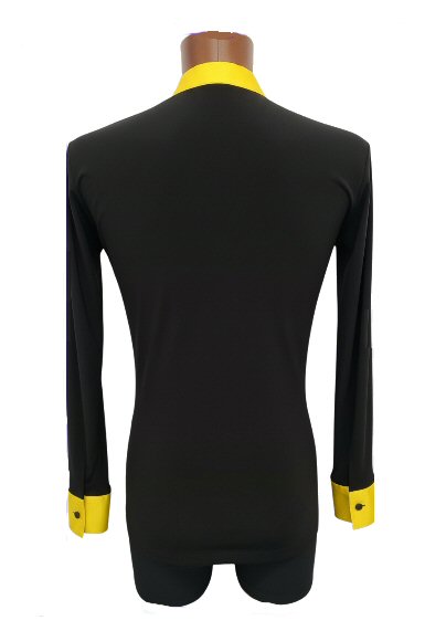 V-neck open chest Latin shirt on shorts Black with yellow trim V-neck open chest Latin shirt on shorts. Black with yellow trim