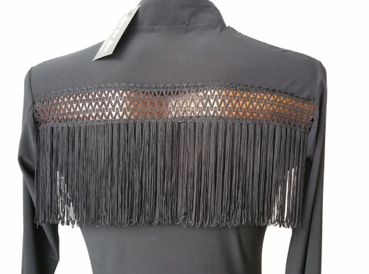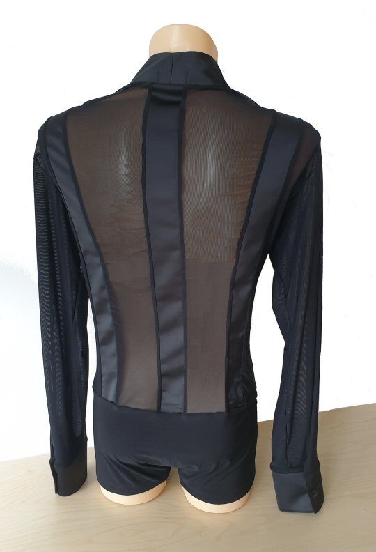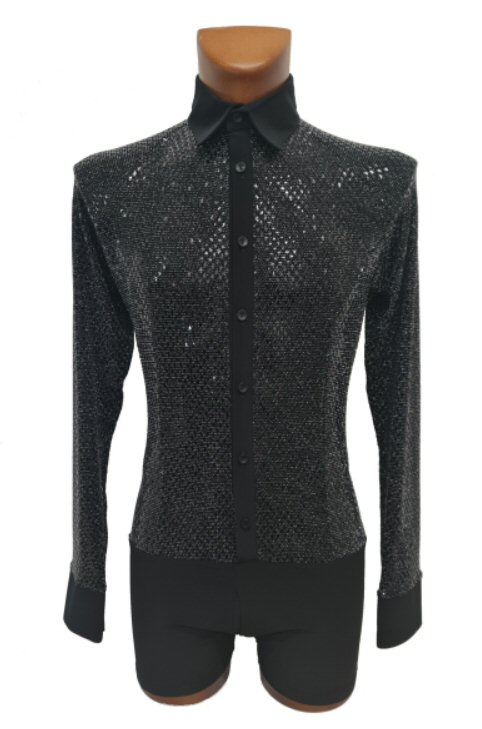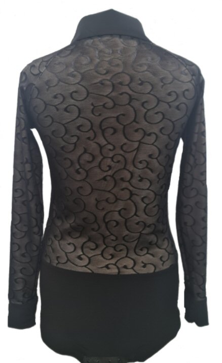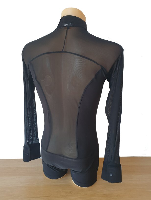 Latin body shirt made in strethy flocked net, A layer of flock net is on flesh mesh lining, so the shirt is not see-through, althought it gives an illusion of being see-through. Single cuff with button.