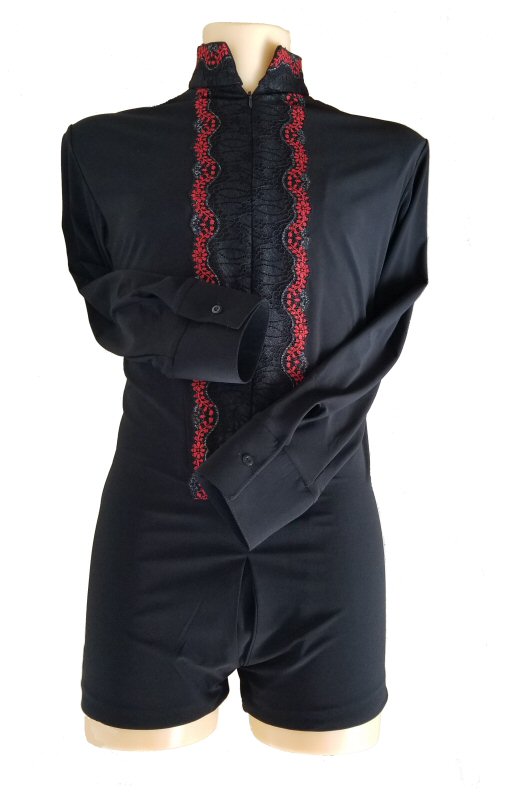 This is a body shirt built on boxer shorts, so it will never pull out of your trousers. Black lace over red underlay on front and back. Traditional collar and cuffs.