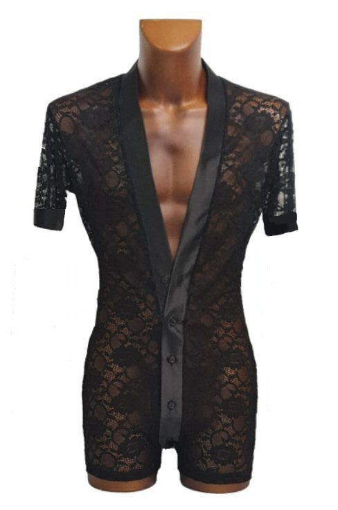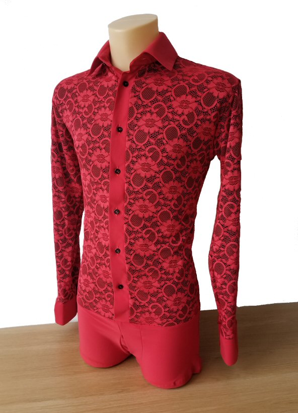 All stretch lace Long V-neck Latin shirt built on boxer shorts, which will never pull out of your trousers. Satin edging around V-neck line and cuffs. Single cuff with button. In this design the collar size is not relevant, sizing goes by chest size.